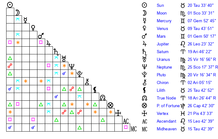 Uranus | 25 Virgo 20 | 26 Taurus 55 | 25 Virgo 40 |