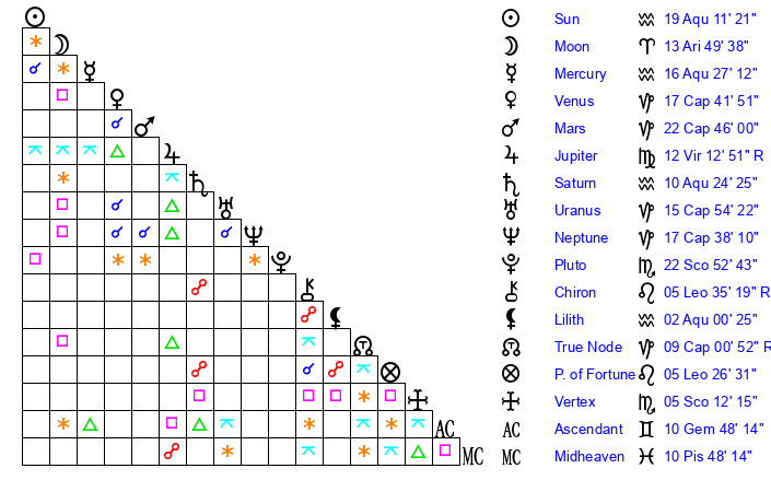 | Moon | 13 Aries 51 | 3 Cancer 23 | 0 Cancer 14 |