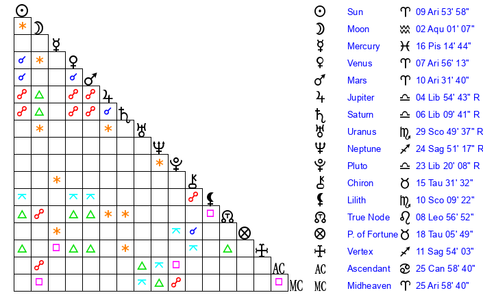 | Moon | 1 Aquarius 54 | 27 Aries 55 | 24 Virgo 44 |