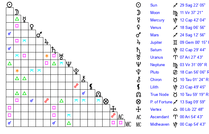 | Saturn | 24 Sagittarius 6 | 26 Pisces 7 | 0 Capricorn 51 |
