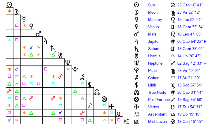 | Moon | 23 Virgo 59 | 23 Pisces 19 | 1 Virgo 52 |