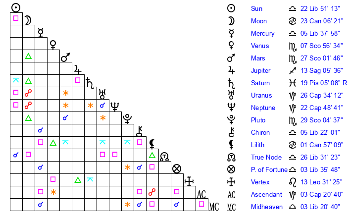 | Sun | 22 Libra 51 | 23 Libra 35 | 22 Scorpio 51 |