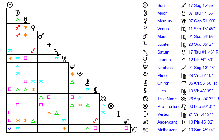 | Neptune | 1 Sagittarius 13 | 29 Pisces 21 | 2 Sagittarius 48 |
