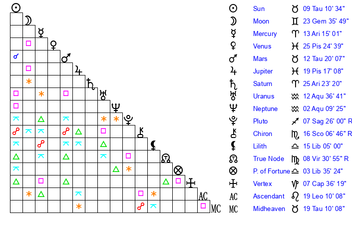 | Sun | 9 Taurus 10 | 9 Taurus 38 | 5 Gemini 14 |