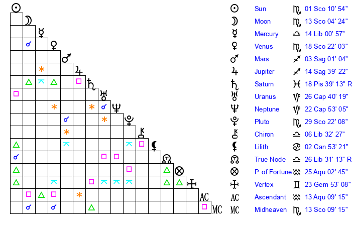 | Moon | 12 Scorpio 58 | 10 Sagittarius 46 | 21 Sagittarius 8 |