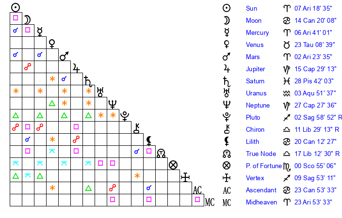 | Sun | 7 Aries 18 | 7 Aries 16 | 5 Taurus 45 |
