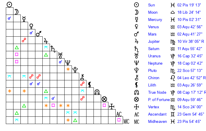 | Saturn | 11 Aquarius 54 | 19 Pisces 44 | 15 Aquarius 20 |