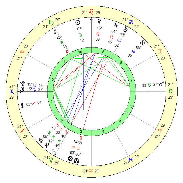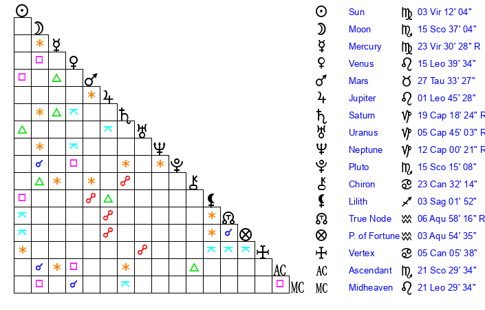 | Mercury | 23 Virgo 29 | 17 Leo 42 | 21 Virgo 37 |