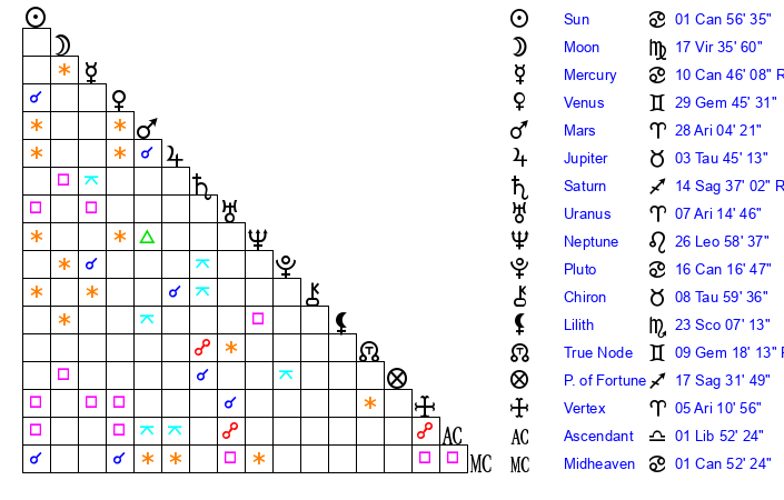 | Moon | 17 Virgo 48 | 8 Gemini 40 | 24 Pisces 14 |