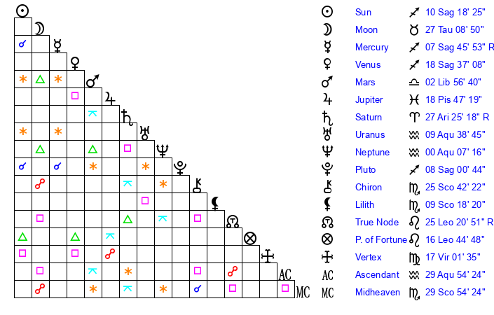 | Moon | 27 Taurus 14 | 27 Sagittarius 50 | 6 Taurus 45 |