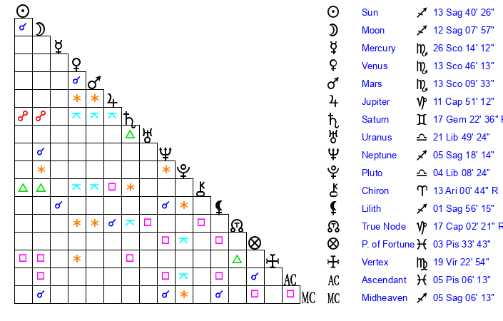 | Neptune | 5 Sagittarius 17 | 29 Pisces 22 | 6 Sagittarius 57 |