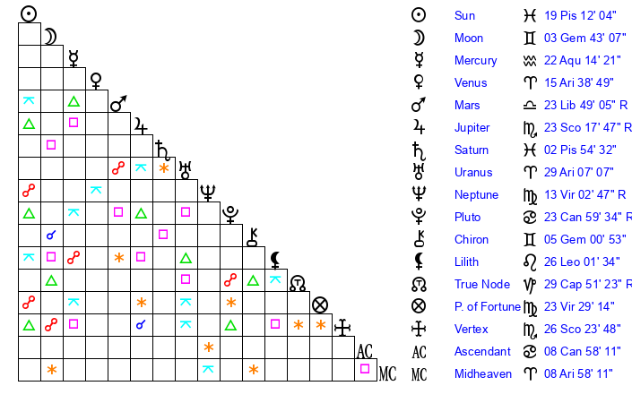 | Sun | 19 Pisces 12 | 20 Pisces 22 | 16 Gemini 57 |