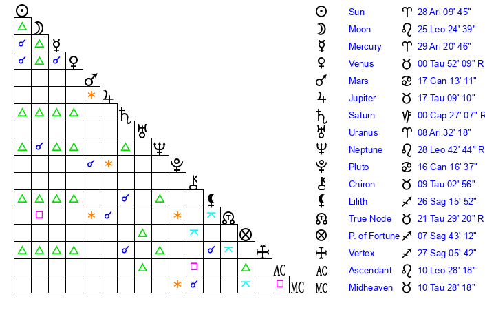 | Sun | 28 Aries 10 | 28 Aries 54 | 0 Leo 19 |