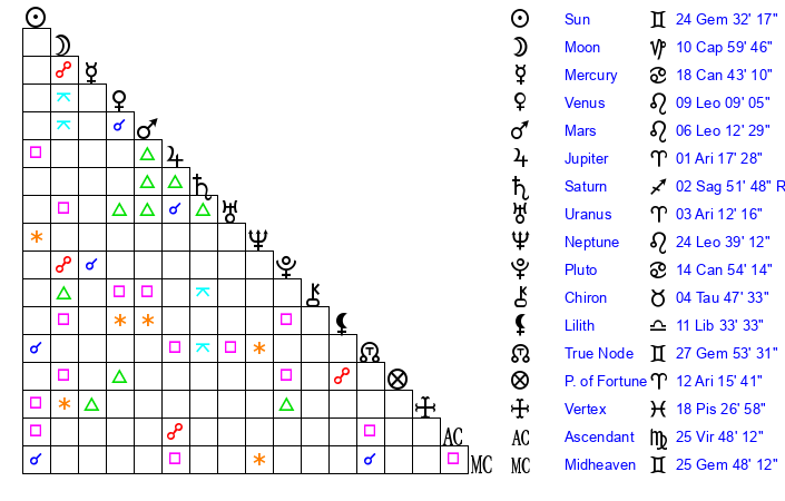 | Sun | 24 Gemini 32 | 25 Gemini 48 | 28 Virgo 41 |