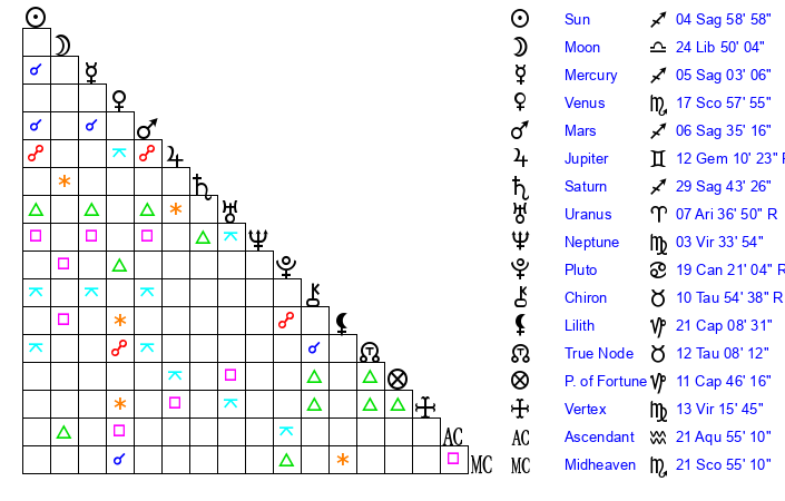 | Moon | 24 Libra 44 | 28 Aquarius 44 | 18 Aries 15 |