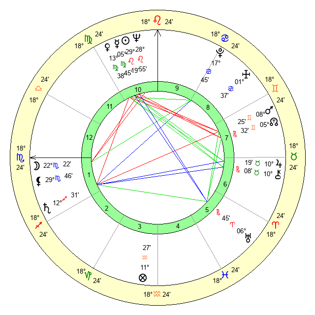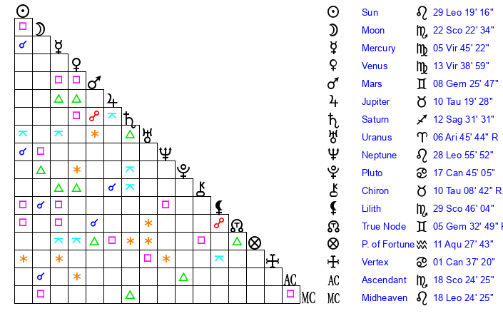 | Moon | 22 Scorpio 30 | 23 Leo 4 | 9 Gemini 49 |