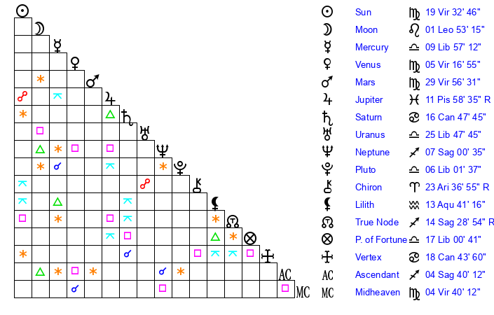 | Sun | 19 Virgo 32 | 20 Virgo 11 | 9 Scorpio 53 |