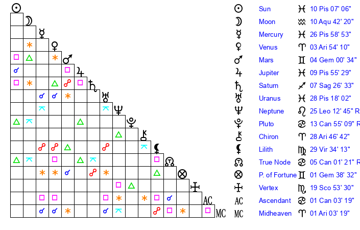 | Sun | 10 Pisces 7 | 11 Pisces 22 | 15 Gemini 56 |