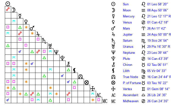 | Neptune | 23 Leo 40 | 2 Aries 3 | 26 Leo 46 |