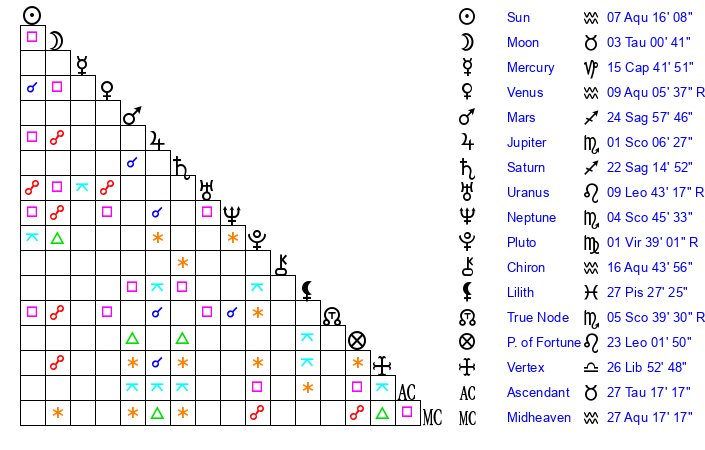 | Sun | 7 Aquarius 16 | 8 Aquarius 1 | 14 Aries 25 |