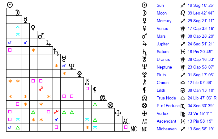 | Sun | 19 Sagittarius 10 | 20 Sagittarius 9 | 18 Capricorn 43 |