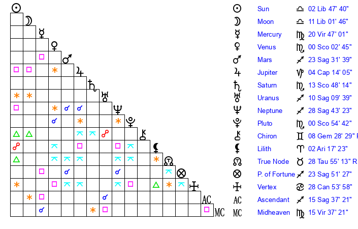 | Moon | 10 Libra 54 | 15 Scorpio 55 | 10 Aries 15 |