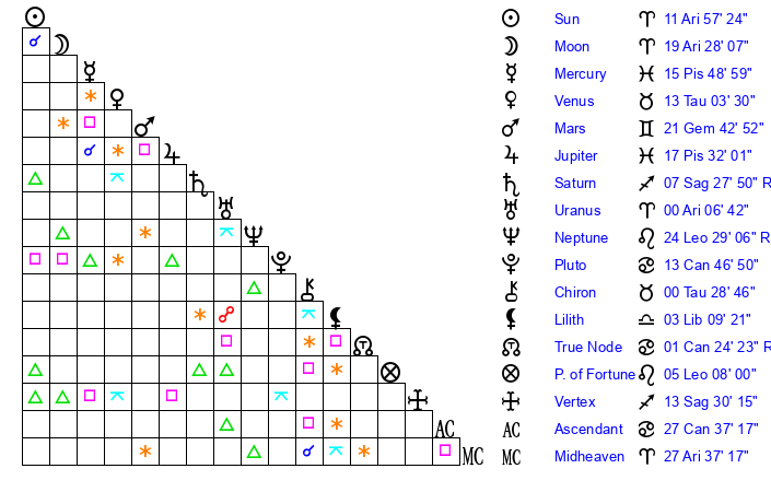 | Moon | 19 Aries 30 | 12 Gemini 27 | 15 Scorpio 53 |