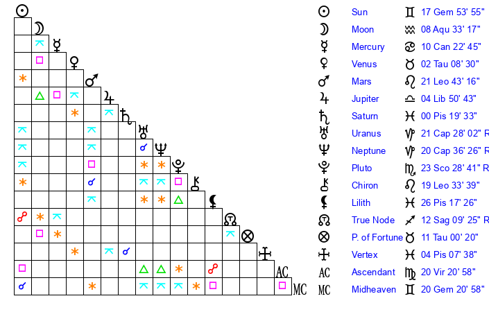 | Moon | 8 Aquarius 32 | 19 Scorpio 2 | 4 Aries 49 |