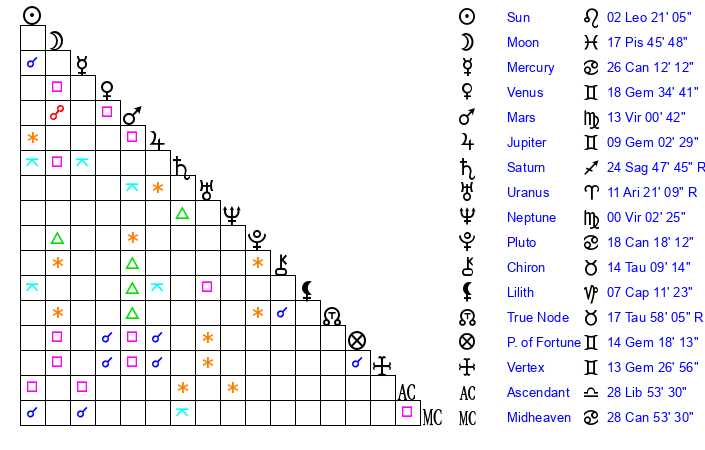 | Neptune | 1 Virgo 9 | 29 Pisces 30 | 28 Leo 51 |