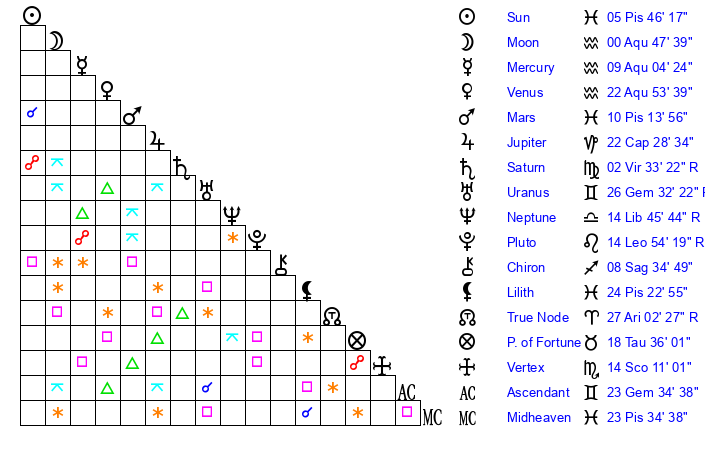 | Mercury | 9 Aquarius 4 | 18 Pisces 51 | 12 Gemini 2 |
