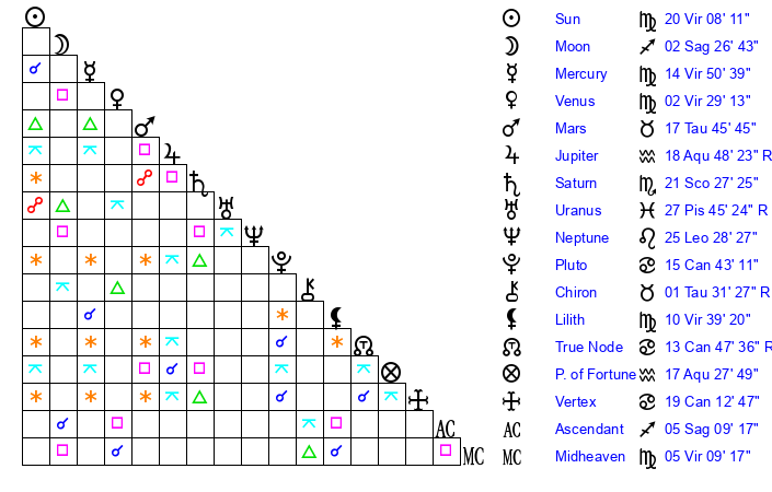 | Sun | 20 Virgo 8 | 21 Virgo 9 | 29 Sagittarius 6 |