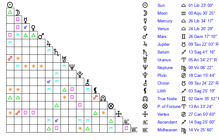 | Sun | 1 Libra 23 | 1 Libra 54 | 8 Capricorn 47 |