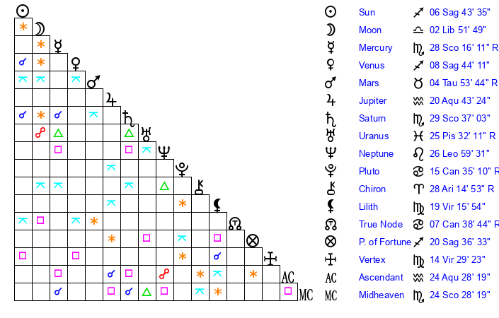 | Sun | 6 Sagittarius 44 | 7 Sagittarius 43 | 17 Pisces 8 |
