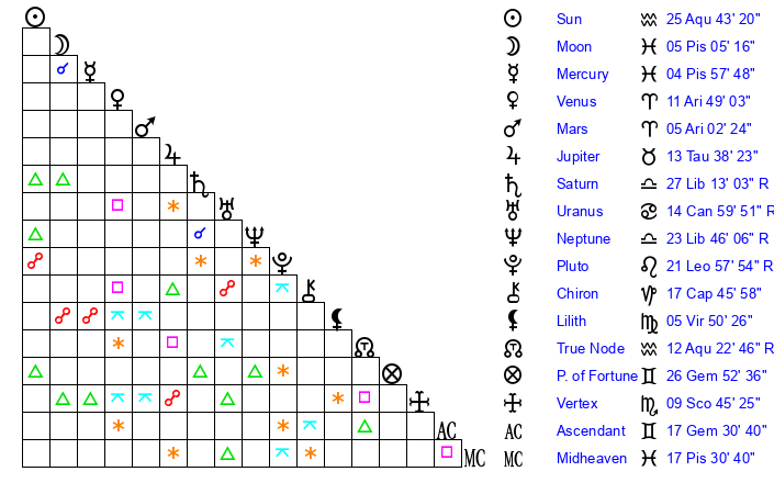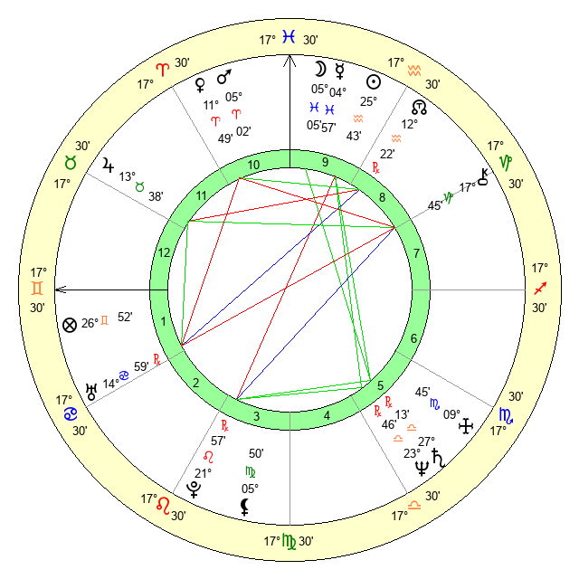 | Moon | 5 Pisces 4 | 20 Virgo 25 | 20 Libra 19 |