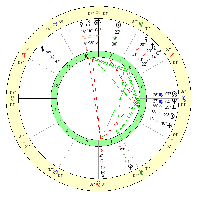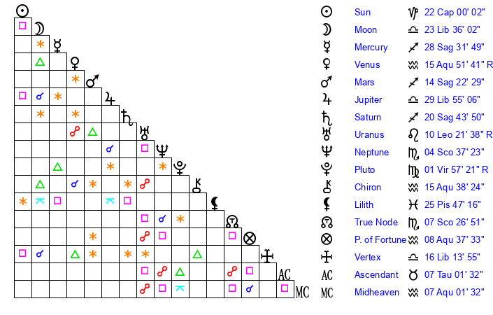 | Moon | 23 Libra 30 | 7 Cancer 18 | 2 Aries 45 |