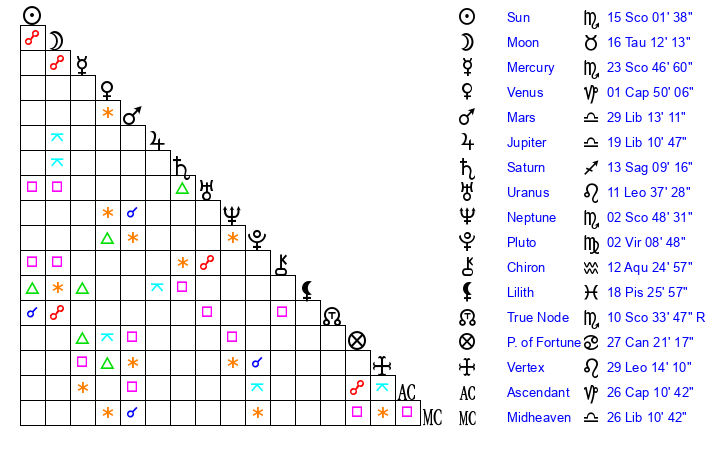 | Neptune | 2 Scorpio 48 | 29 Pisces 39 | 4 Scorpio 38 |