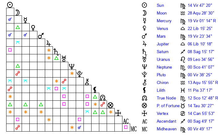 | Pluto | 0 Virgo 38 | 1 Aquarius 39 | 2 Virgo 13 |