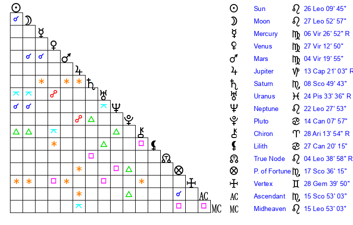 | Mercury | 6 Virgo 27 | 8 Leo 24 | 25 Sagittarius 54 |