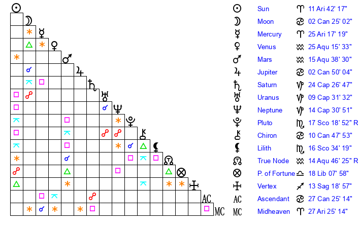 | Mars | 15 Aquarius 38 | 23 Cancer 50 | 11 Pisces 47 |