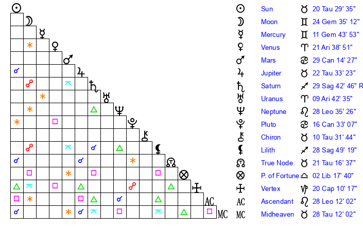 | Jupiter | 22 Taurus 30 | 23 Gemini 35 | 12 Gemini 23 |
