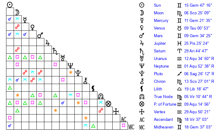 | Moon | 6 Scorpio 23 | 25 Libra 21 | 2 Scorpio 33 |