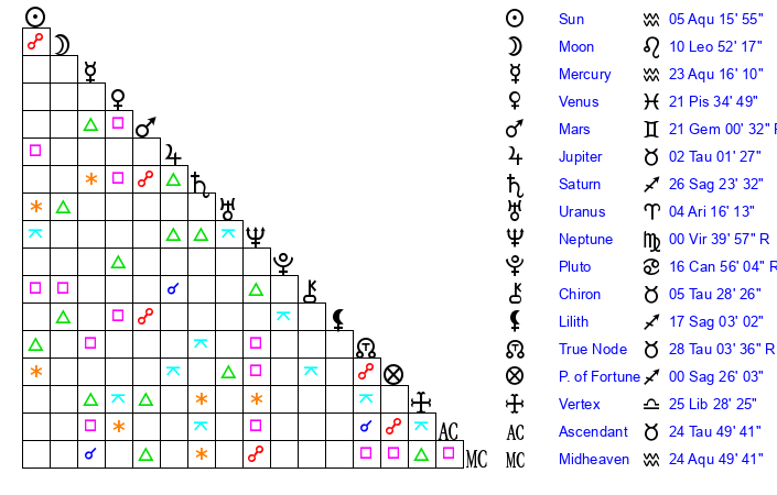 | Sun | 5 Aquarius 16 | 5 Aquarius 59 | 10 Taurus 49 |