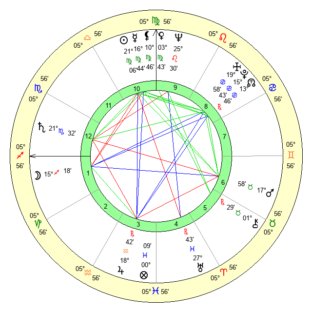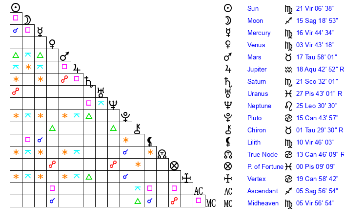 | Sun | 21 Virgo 6 | 22 Virgo 8 | 0 Capricorn 7 |