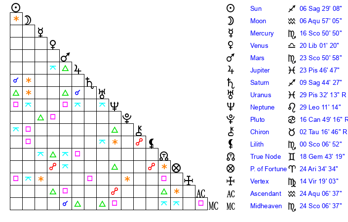 | Mercury | 16 Scorpio 51 | 20 Scorpio 42 | 26 Aquarius 16 |