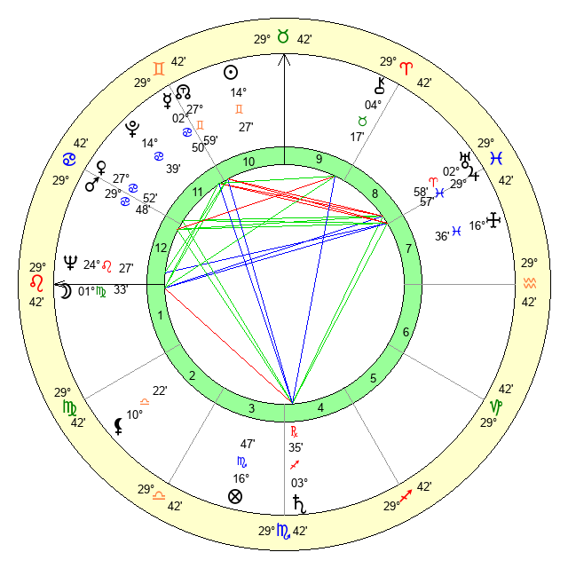 | Moon | 1 Virgo 39 | 18 Libra 59 | 27 Pisces 8 |