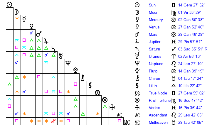 | Sun | 14 Gemini 28 | 15 Gemini 43 | 18 Virgo 24 |