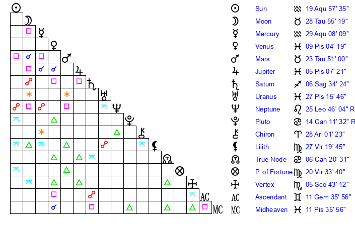 | Moon | 28 Taurus 57 | 16 Cancer 46 | 18 Sagittarius 53 |