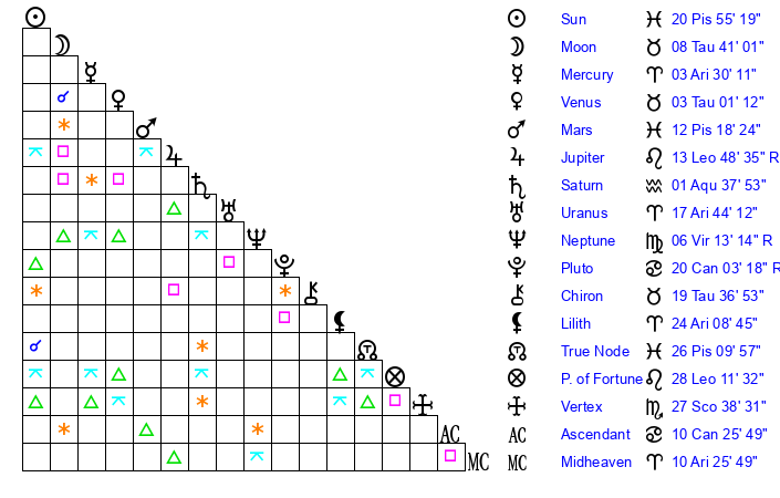 | Sun | 20 Pisces 55 | 21 Pisces 22 | 21 Gemini 28 |
