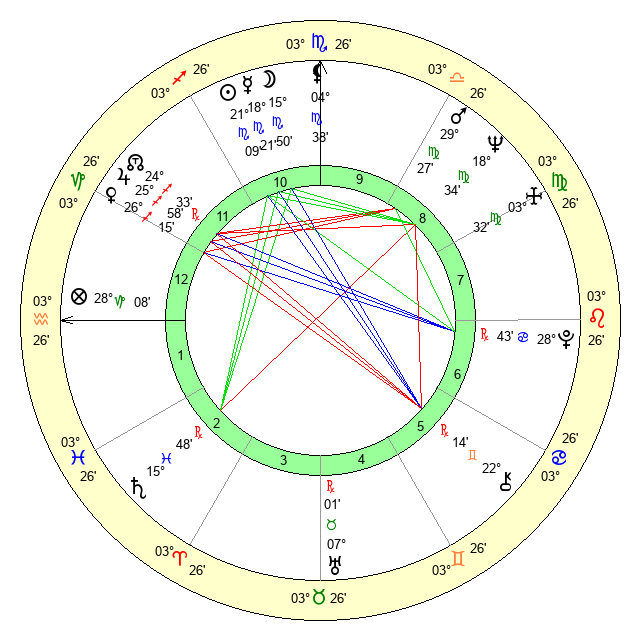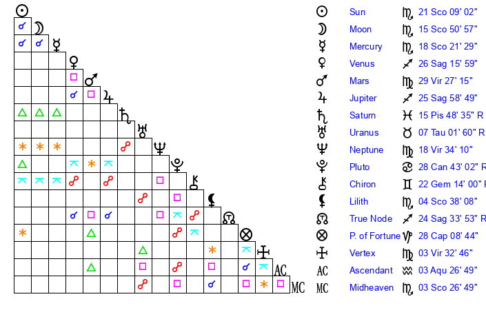 | Moon | 15 Scorpio 54 | 9 Virgo 1 | 13 Aquarius 54 |
