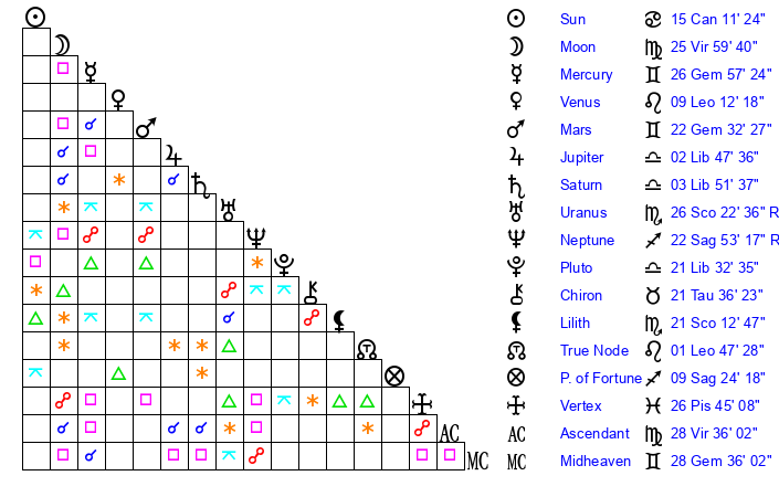 Moon | 26 Virgo 8 | 5 Sagittarius 57 | 28 Aries 15 |